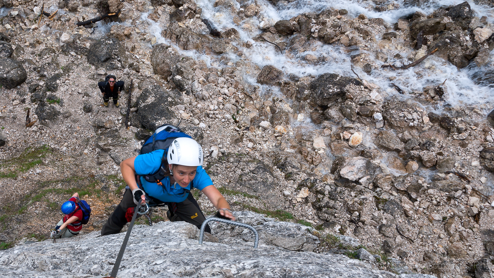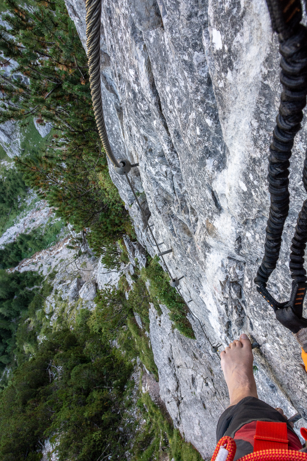 … ist ein sehr sportlicher Klettersteig im oberen Schwierigkeitsrahmen mit zwei Schlüsselstellen, zuerst beim Einstieg, dann im letzten, Kraft raubenden Abschnitt. Gemischte Bauart, Stahlseil (ziemlich straff), starke Felsanker (teils Ösenanker), wenige Tritthilfen (Stifte/Bügel). Kein Notabstieg.
